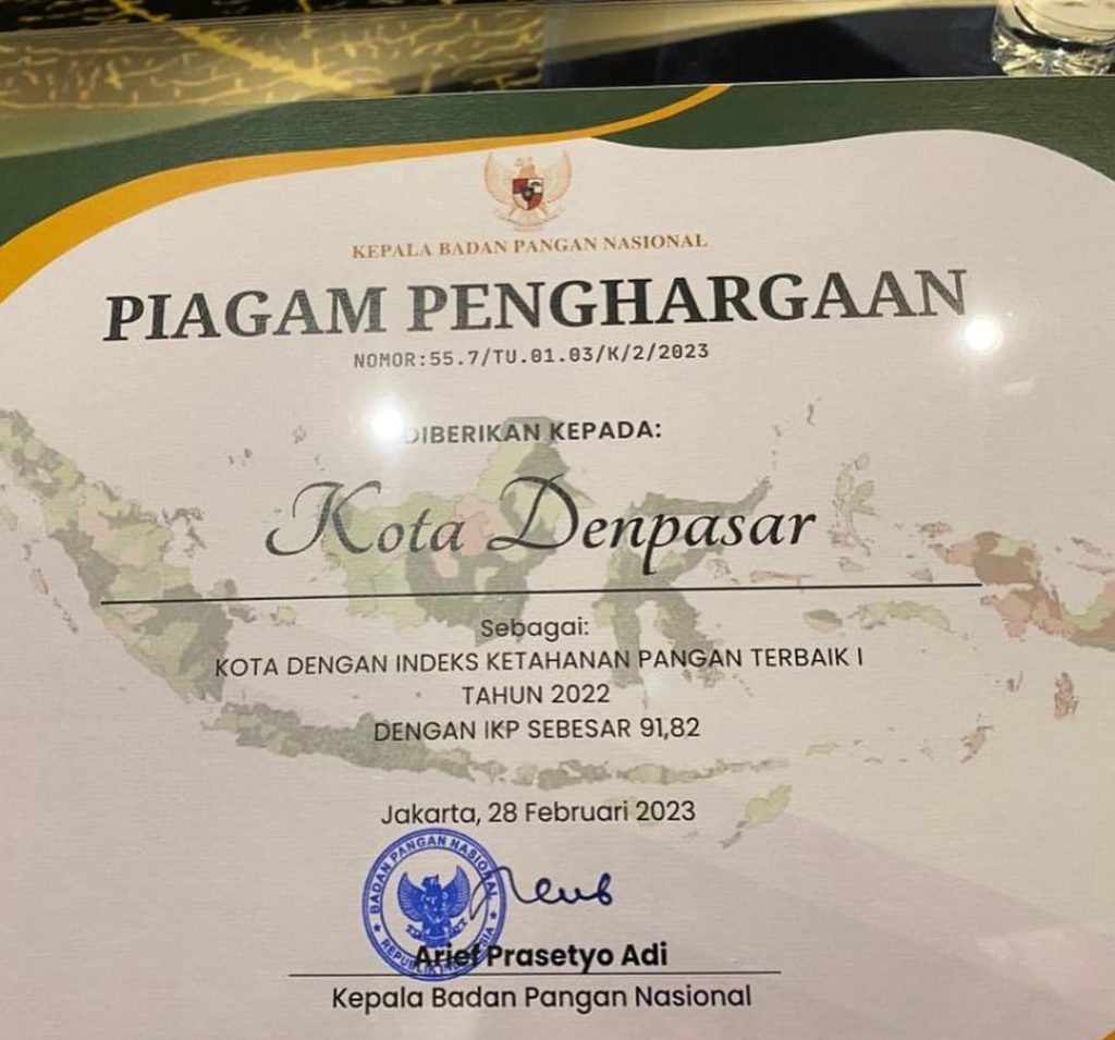 Kadis Perikanan dan Ketahanan Pangan Kota Denpasar, IB Mayun Suryawangsa didampingi Kabid Ketersediaan dan Distribusi Pangan, Ni Made Suparmi mengatakan, Pemerintah Kota Denpasar Tahun 2022 memperoleh penghargaan sebagai apresiasi terhadap perolehan Indeks Ketahanan Pangan (IKP) Terbaik, dari 5 Kota yang mendapat penghargaan. Dimana, Pemkot Denpasar Peringkat I Kota Denpasar dengan IKP 91,82.