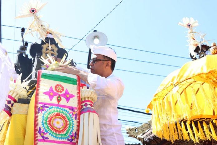 Walikota Denpasar, I Gusti Ngurah Jaya Negara menghadiri Karya Tawur Wrespati Kalpa Madya, Memungkah, Ngenteg Linggih, Mupuk Pedagingan, dan Pedudusan Alit di Pura Pasek Gelgel Pegatepan Prasanak Dalem Tibung Desa Adat Padangsambian, Selasa (8/8).