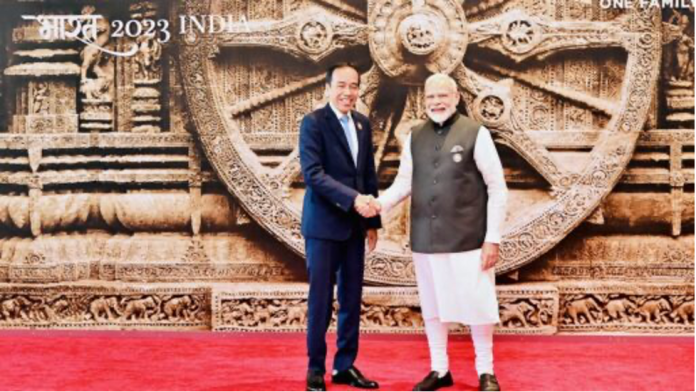 “Kedua pemimpin negara pun tampak berfoto bersama sambil berjabat tangan dengan latar belakang roda yang menjadi ikon dari Kornark Sun Temple yang merupakan bagian dari situs warisan dunia UNESCO.”