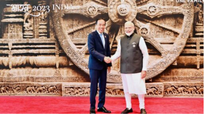 Kemudian, Presiden Jokowi bersama para pemimpin negara G20 melanjutkan kegiatan menuju ruang pertemuan untuk melaksanakan pertemuan sesi pertama KTT G20 India yang mengangkat topik dengan tema “One Earth”.