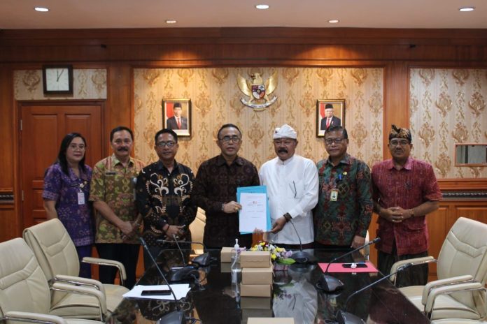 DENPASAR, KEN-KEN – Walikota Denpasar, I Gusti Ngurah Jaya Negara bersama Bendesa Adat Panjer, AA Ketut Oka Adnyana menandatangani Perjanjian dan Serah Terima Lahan yang saat ini dimanfaatkan untuk SDN 1 Panjer di Kantor Walikota Denpasar, Jumat (23/2). Penandatanganan tersebut merupakan wujud nyata komitmen kedua belah pihak dalam mendukung kemajuan pendidikan di Kota Denpasar, khususnya wilayah Panjer.