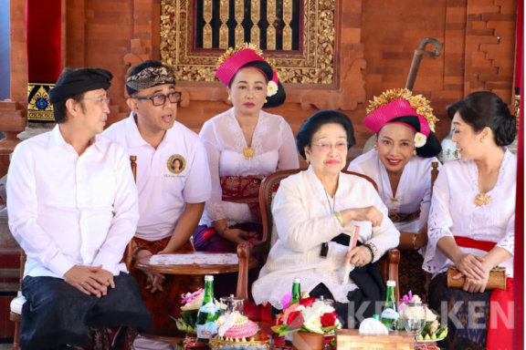 Foto: Presiden ke-5 Megawati Soekarnoputri, Prananda Prabowo, Walikota Jaya Negara, Ny. Antari Jaya Negara, Bintang Puspayoga, saat menghadiri pelebon ibunda Jaya Negara, (4/8).