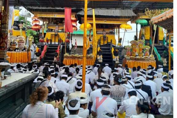 GIANYAR, KEN-KEN – Pemedek yang merupakan Pratisentana Shri Nararya Kreshna Kepakisan (SNKK) memadati utama mandala Dalem Agung Pura Kawitan SNKK, Selukat, Desa Keramas, Kecamatan Blahbatuh, Gianyar, untuk melaksanakan persembahyangan Pujawali Ida Bhatara Kawitan bertepatan dengan Saniscara Wuku Kuningan.