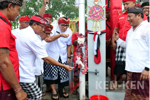 TABANAN, KEN-KEN – Bupati Tabanan, I Komang Gede Sanjaya menghadiri sekaligus meresmikan Tower Air Bersih (Toya Beji) Abianlalang di Banjar Abianlalang, Desa Wanasari, Tabanan, Selasa (17/2). Peresmian ditandai dengan pembukaan simbolis kran pertama usai pelaksanaan upacara pemelaspasan.