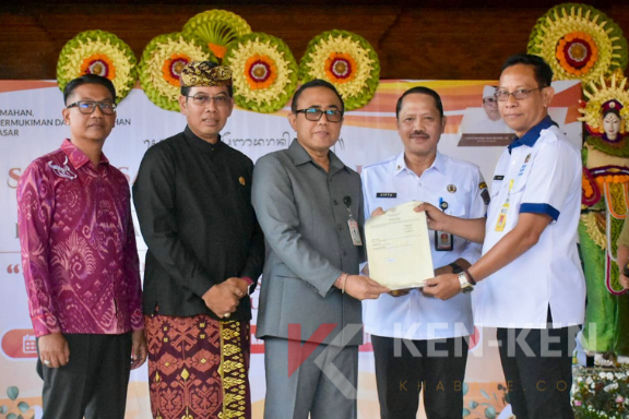 Penyerahan dilakukan oleh perwakilan BPN Kota Denpasar kepada Wali Kota Denpasar, I Gusti Ngurah Jaya Negara, dalam kegiatan Sosialisasi Penyadaran Publik Pencegahan Kawasan Kumuh yang digelar di Bale Banjar Pemangkalan, Desa Ubung Kaja, Rabu (25/3).